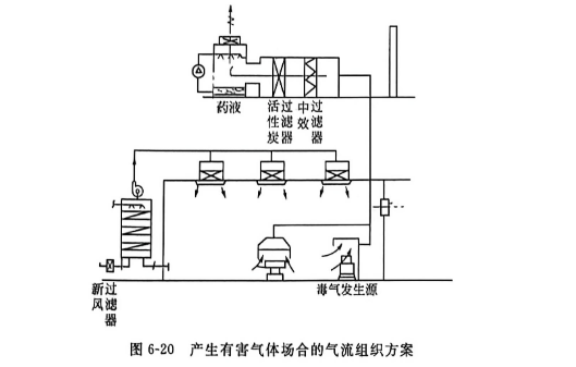 圖6-20是在產(chǎn)生有毒氣體場合的氣流組織方案,此時排風量要經(jīng)過符合環(huán)保要求的處理后排出室外。